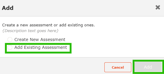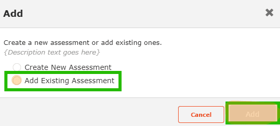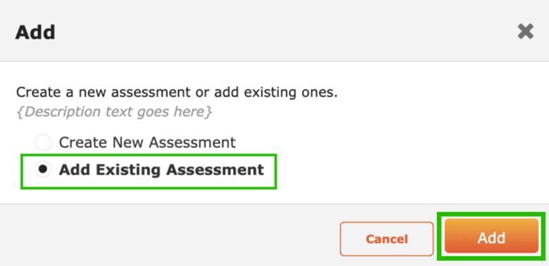 In the Add pop-up window, select Add Existing Assessment. Then click Add.