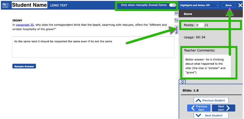 that may require manual scoring, use the Only show manually Scored Items toggle in the upper toolbar.